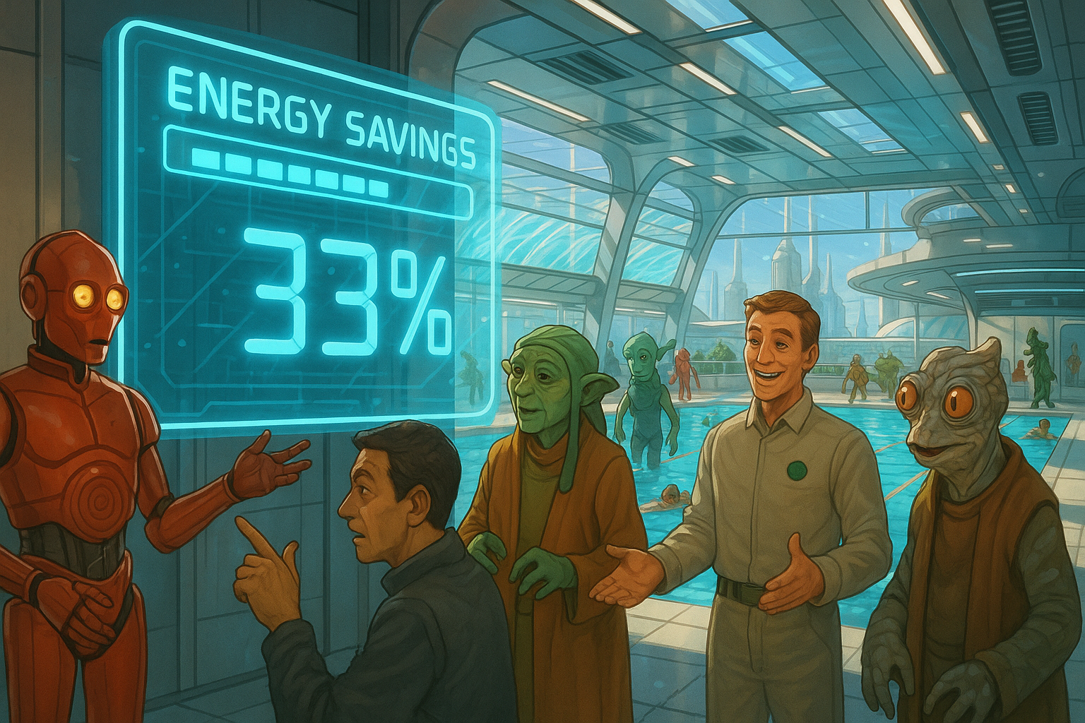 In the bustling community of Coruscant, the reopening of the municipal swimming pool after significant renovations offers a unique opportunity to tackle the pressing issue of energy inefficiency in public spaces. As highlighted in the facility’s updated systems, there is still a disconnect in awareness and engagement regarding energy conservation among residents. While the facility manager noted that visitors were surprised at their interest in energy savings, there remains a vast potential for fostering a deeper communal investment in sustainability. Hence, this project seeks to not only enhance community health through aquatic activities but also promote a culture of environmental mindfulness that can extend beyond the pool itself.